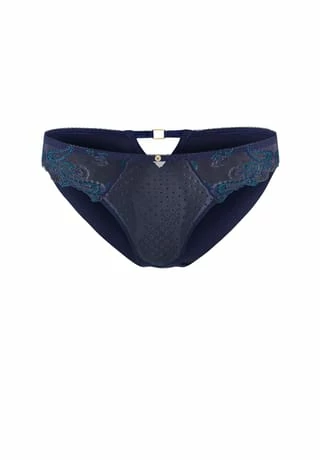 – eleganter Rio-Slip – Vorderseite aus Tupfen-Tüll und besticktem Lycra® Gewebe – Rückseite aus glattem Clean-Cut-Gewebe – schmaler Stretchbund mit Mäusezahnspitze – Cut-Out auf der Rückseite mit Samtüberzug – gehämmerte Schmuckelemente aus vergoldetem Zamak – Zwickel mit Baumwolle unterlegt