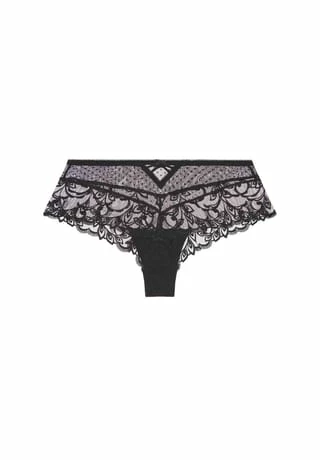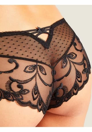 – Saint-Tropez-Slip aus mehrsträngigem Tupfentüll – bestickte Spitze aus Lycra® – Zierschleife aus Satin am Bund – Cut-Out mit Zierschnürung auf der Rückseite – Zwickel mit Baumwolle unterlegt