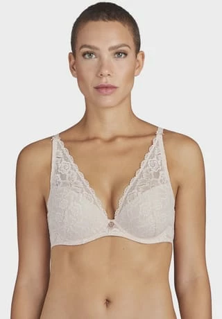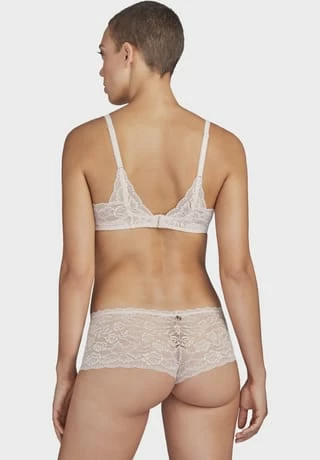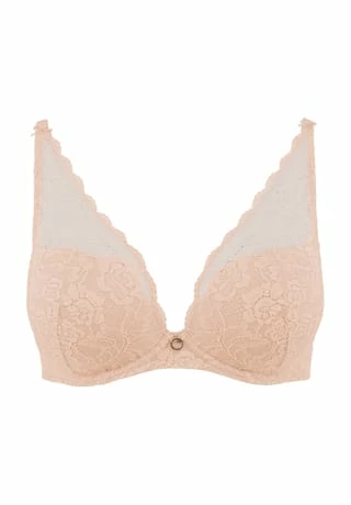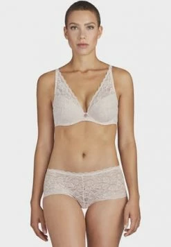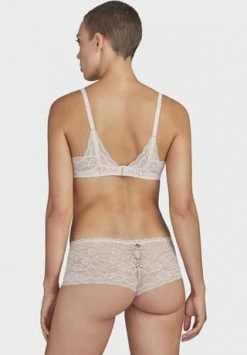 – Triangel-BH mit blickdichten Einlagen – tiefer Ausschnitt – goldfarbenes Schmuckdetail am Mittelsteg – Kamin-Rücken aus Spitze – längenverstellbare Träger aus Jacquard-Spitze – zweireihiger, 3-fach verstellbarer Häkchenverschluss